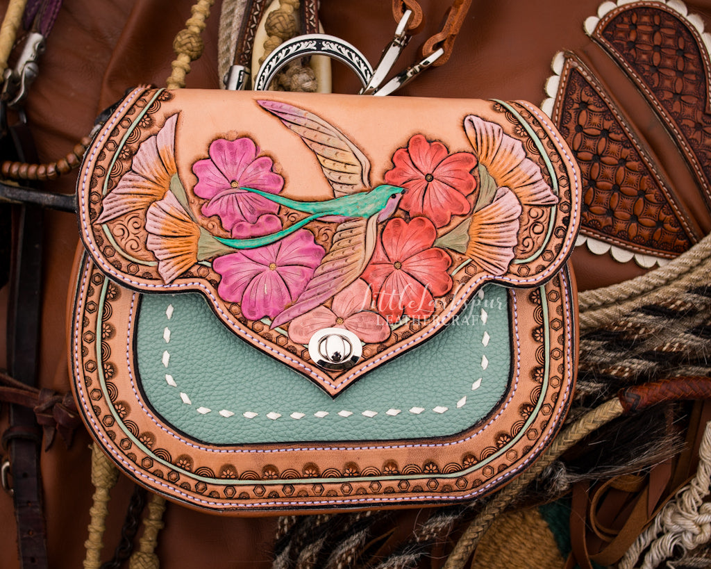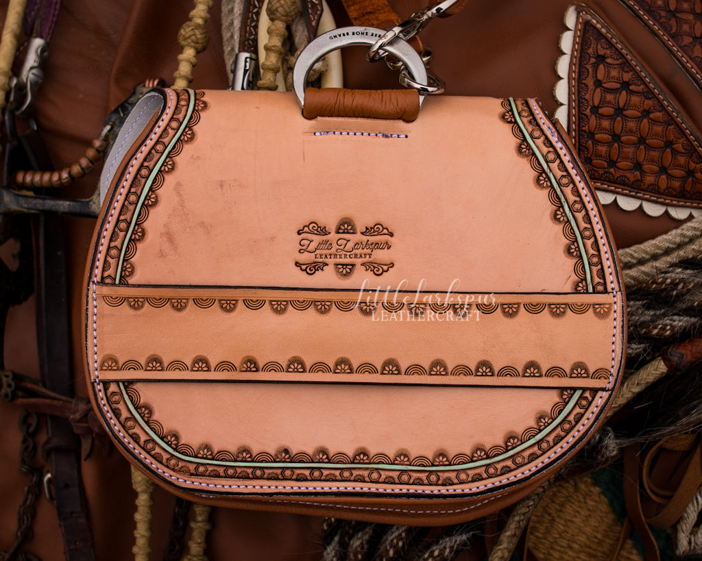 This saddle bag purse is exactly what it sounds like. A purse that can also be attached to your back cinch. Simply unclip the shoulder strap, slip your back cinch through the strap on the back of the purse and use the ring at the top to tie it to your saddle via your saddle strings. This comes with a twist-lock style closure.