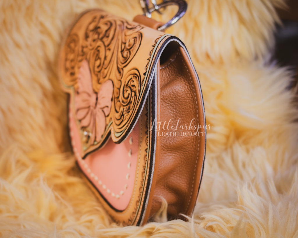 It has a fully lined interior, hand tooled exterior with buckstitch accents and Jeremiah Watt stainless hardware. It measures 11”x8.5”x3”.