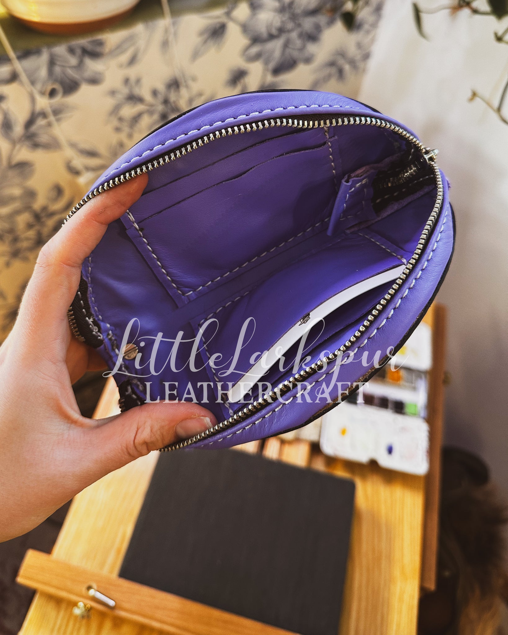 This handcrafted clutch is made from premium Hermann Oak vegetable-tanned leather, hand tooled with an intricate western floral design. A soft lavender leather gusset and fully lined lavender interior add an unexpected pop of color while maintaining durability and structure.