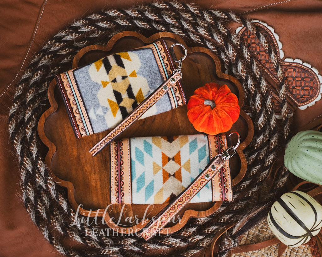 These clutches measure 8”x4” with a 3” gusset and 4 card slots as well as a wrist strap. Inlayed with real Pendleton wool!